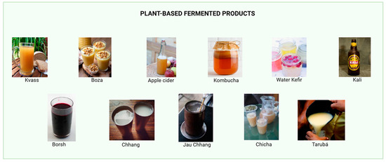| Kvass | Russia | Rye and barley malt or flour and rye bread | Leuconostoc mesenteroides, Lactobacillus casei, and Saccharomyces cerevisiae | 4–10 h | [17,27] |