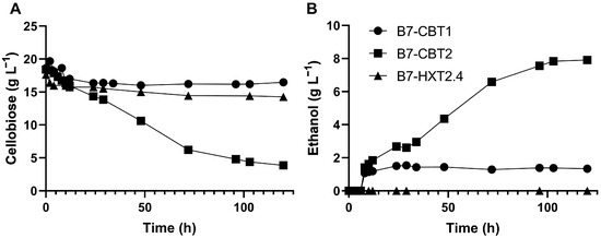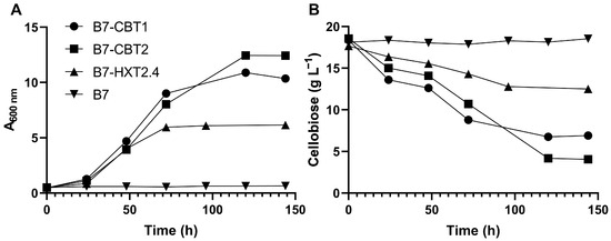 Cell growth (A) and cellobiose consumption (B) in YNB medium containing 20 g/L cellobiose by the indicated yeast strains harboring the intracellular SpBGL7 β-glucosidase (strain B7), or this strain also transformed with the pGPD-426 plasmids containing the genes (CtCBT1, MgCBT2, and SiHXT2.4) encoding sugar transporters.