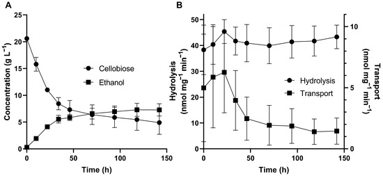 In order to better understand the reason for the cellobiose incomplete fermentation by strain B7-CBT2 (pGPD-424-SpBGL7 + pGPD-426-MgCBT2, Table 1), we initially used pNPβG, a synthetic analog of cellobiose, in a colorimetric assay to determine the transport activity of the MgCBT2 permease, as already described for the maltose permeases of S. cerevisiae [59]. After growth on cellobiose, the B7-CBT2 strain was capable of transporting 7.4 ± 1.6 nmol of pNPβG mg−1 min−1. The B7-CBT2 cells were also capable of transporting pNPβX (3.3 ± 0.1 nmol mg−1 min−1), indicating that the MgCBT2 permease probably also transports xylobiose. Figure 3 shows the intracellular β-glucosidase activity (determined with pNPβG), as well as the pNPβG transport activity (both activities were determined with 5 mM of substrate), during the incomplete cellobiose fermentation by strain B7-CBT2.