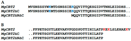 Sequence alignment of the cytoplasmic N-terminal first 43 amino acids (A) and the cytoplasmic C-terminal last 43 amino acids of the protein, after the last transmembrane domain (B), deduced from the MgCBT2 gene, and the truncated versions of MgCBT2 at the C-terminal domain (MgCBT2ΔC), or at both the N- and C-terminal domains (MgCBT2ΔNΔC). The lysine residues with medium (blue) or high (red) ubiquitinylation potential were determined with the BDM-PUB [61] and UbPred programs [62].