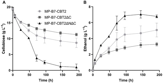 These cellobiose transporters (MgCBT2, MgCBT2ΔC, and MgCBT2ΔNΔC), as well as the intracellular SpBGL7 β-glucosidase, were introduced into the genome of an industrial S. cerevisiae strain (MP-C5H1) capable of fermenting xylose, using CRISPR-Cas9 as described in Materials and Methods. As can be seen in Figure 5, while the strain harboring the MgCBT2ΔC transporter continued to produce incomplete cellobiose fermentations as the strain with the wild-type MgCBT2 permease, the strain with the MgCBT2ΔNΔC permease was able to consume and ferment all the cellobiose present in the medium, producing higher levels of ethanol. However, is important to note that although this yeast strain with MgCBT2ΔNΔC consumes all the sugar, the ethanol yield (Yp/s = 0.38 ± 0.01 g of ethanol/g of consumed cellobiose) is very similar to the one obtained with the strain harboring the truncated MgCBT2ΔC transporter (Yp/s = 0.39 ± 0.01 g of ethanol/g of consumed cellobiose), and lower when compared with the wild-type MgCBT2 permease (Yp/s = 0.47 ± 0.02 g of ethanol/g of consumed cellobiose).