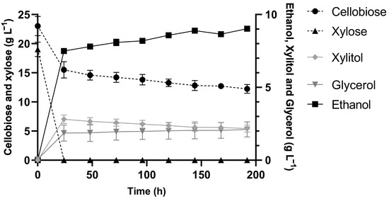 Finally, since cellobiose transport and intracellular hydrolysis by recombinant S. cerevisiae may contribute to cellobiose–xylose co-fermentations [29,30,31], we performed such fermentations with the industrial xylose-fermenting strain MP-C5H1 harboring the MgCBT2ΔNΔC transporter and SpBGL7 β-glucosidase (strain MP-B7-CBT2ΔNΔC, Table 1). As can be seen in Figure 6, xylose is indeed totally consumed and fermented in the first 24 h, and although cellobiose is also consumed during that period, it is consumed very slowly after that time point (thus an incomplete cellobiose fermentation), even considering that the strain harbors the MgCBT2ΔNΔC transporter lacking lysine residues in both the N- and C-terminal domains. While cellobiose is consumed slowly, the xylitol produced from xylose fermentation also drops, thus both are probably contributing to the slight increase in ethanol produced (from 7.5 to 8.9 g/L) by the cells during the slow fermentation.