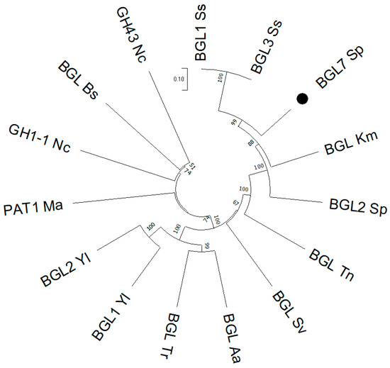 Phylogenetic classification of β-glucosidases from various yeast and fungal hosts. The phylogenetic tree contains 15 enzyme sequences, and the numbers at the nodes represent percentage bootstrap values based on 1500 samplings. The abbreviation of each species is added after the name of the β-glucosidase genes: Ss = Scheffersomyces stipitis, Sp = Spathaspora passalidarum, Km = Kluyveromyces marxianus, Tn = Thermotoga neapolitana, Sv = Streptomyces venezuelae, Aa = Aspergillus aculeatus, Tr = Trichoderma reesei, Yl = Yarrowia lipolytica, Ma = Moesziomyces antarcticus, Nc = Neurospora crassa, and Bs = Bacillus subtilus.