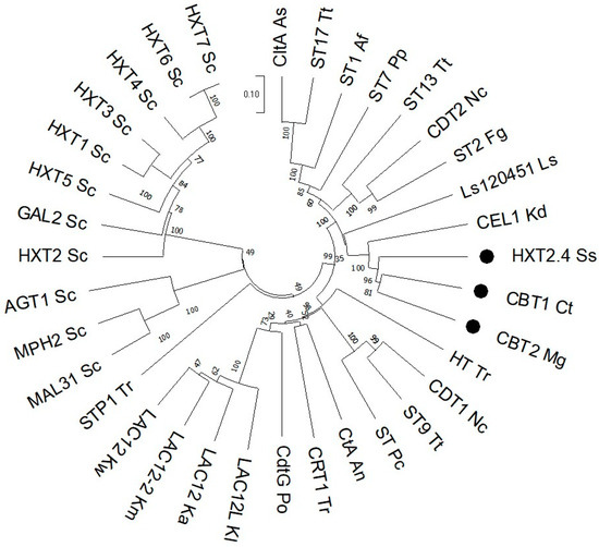 We have cloned an intracellular β-glucosidase gene (SpBGL7) from the cellobiose fermenting yeast Sp. passalidarum [39] and expressed it in S. cerevisiae. While the β-glucosidase gh1-1 from N. crassa belongs to the GH1 family of glycosyl hydrolases, the cloned enzyme belongs to the GH3 family, where are found not only β-glucosidases but also β-xylosidases and other enzymes. The SpBGL7 enzyme had higher affinity with pNPβG and pNPβX, and lower affinity with cellobiose, as already reported for other β-glucosidases characterized biochemically from yeasts [66,67]. Figure 7 shows a phylogenetic analysis of some β-glucosidases from yeasts and fungi, including the BGL7 from Sp. passalidarum cloned in this work. Using the S. cerevisiae strain expressing the SpBGL7 enzyme allowed the identification and cloning of three yeast cellobiose transporters that permitted the growth of the strain in the presence of cellobiose. Figure 8 shows that the three transporters (we included the HXT2.4 permease from Sc. stipitis [37], although the transporter we cloned was from Sc. illinoinensis) are close to the known yeast cellobiose transporters, including the one cloned from L. starkeyi [38] and a cellobiose transporter CEL1 from Kluyveromyces dobzhanskii (that allows growth of S. cerevisiae on cellobiose, but no fermentation data are available) [68]. Note that in general, Kluyveromyces yeasts can utilize cellobiose through the lactose permease encoded by LAC12. The cloned transporters are also closer to CDT-2 from N. crassa, and other transporters known to transport cellodextrins and xylobiose.