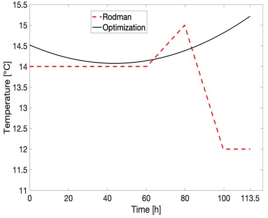 11], aligns with the primary objective of this study, as both focus on maximizing ethanol yield while minimizing the production of undesirable by-products. This study demonstrates a 1.43% increase in ethanol production, rising from 59.1 g/L in Rodman’s work to 59.95 g/L. This improvement is significant, particularly as it was achieved while simultaneously reducing the concentrations of diacetyl (DY) from 0.09 ppm to 0.007 ppm and achieving a modest decrease in ethyl acetate (EA), from 1.35 ppm to 1.34 ppm. The comparison of the optimal manipulated profiles can be seen in