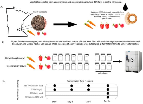 Vegetables were purchased and brought to a certified food lab at the University of Minnesota and prepared with basic in-home fermentation techniques, utilizing what is described as “wild” or “natural” fermentation, which relies on naturally occurring bacteria and yeast to ferment foods. Briefly, all jars, lids, and glass fermentation weights were washed and sanitized prior to use. As noted previously, vegetables were thoroughly washed in cold chlorinated water and gently scrubbed with a vegetable brush prior to fermentation. The carrots and peppers were cut into smaller pieces and radishes were cut in half. For each conventional and organic vegetable, nine (32 oz) wide-mouth ball jars were filled with ¾ of the cut vegetables and enough salt water (50 g/L, Diamond Crystal Kosher salt) to cover them. The sanitized glass fermentation weights and Masontops “pickle pipes” (for lids) were put on top of six of each the conventional and organic vegetable jars. The remaining 3 jars from each of the conventional and organic vegetables were autoclaved for 30 min as noted in Raghuvanshi et al. (2019) []. The autoclaved jars were used as sterile controls, to assess the extent to which the native/soil microbial communities of each vegetable contributed to their probiotic or nutritional (metabolite) content. Samples and pH readings (to ensure proper and safe fermentation) from each vegetable were taken on day 1 (24 h), day 3 (72 h), day 7 (168 h), and day 14 (336 h) along the fermentation process for a total of n = 216 samples (please see Supplementary Table S1 for pH records). All samples were moved to a −80 °C freezer immediately after sampling. On day 14, samples of the vegetables and vegetable brine were taken for metabolomic analyses. For a detailed view of the study’s schematic design, please see Figure 1.
