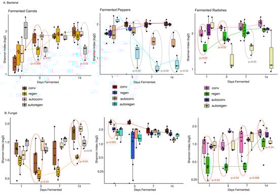 Bacterial and Fungal differences in alpha diversity of fermented vegetables. Alpha diversity (Shannon Index) for bacteriome (A) and mycobiome (B) of regenerative and conventional fermented carrots, peppers, and radishes during a 14-day fermentation period. Statistical significance calculated with Wilcoxon rank-sum test within a day between conventional and regenerative samples (red circles) and autoclaved conventional and autoclaved regenerative samples (gray circles). Color line is shown only if there were significant differences across fermentation days for each ferment group according to the Kruskal–Wallis test.