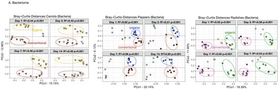 After 24 h of fermentation (D1), the only differences observed in bacterial alpha diversity (Shannon Index) between the conventional and regenerative ferments was seen in the radishes and carrots, with higher diversity for the conventional version at D1 and D3 (Figure 2A; Wilcoxon rank-sum test; p < 0.005). Yet, by the end of fermentation, D14, no bacterial diversity differences were seen between the conventional and regenerative ferments for any vegetable. Remarkably, by day 14 of the fermentation process, the autoclaved conventional samples showed greater bacterial diversity compared with their regenerative counterparts (p < 0.05). Bacterial richness, expressed as the number of amplicon sequence variants (ASVs), showed greater values for radishes only, at D14 (Figure S1A; p = 0.03).