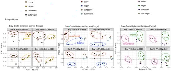 Throughout the 14-day fermentation period, conventional and regenerative ferments displayed significantly different microbiome compositions (Figure 3A,B). For the most part, although the autoclaved samples clustered close to their conventional or regenerative counterparts, they usually showed unique compositional patterns. However, in the radishes mycobiome, all conventional samples continually showed substantially distinct fungal communities compared with the autoclaved or organic samples. Interestingly, in both the bacteriome and mycobiome of the fermented peppers, the conventional and regenerative samples remain very distinct from their autoclaved counterparts.