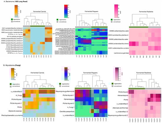 Like in other studies [,], our analysis of fungal communities also showed that many of the ITS2 sequences generated could not be assigned to any taxonomic group. Nonetheless, some indicator species were evident. Regenerative fermented carrots displayed an unidentified fungus ASV, Pichia kluyveri and Plectosphaerealla cucumerina. Conventional fermented carrots were characterized by abundances of a different ASV of Pichia kluyveri, the genus Pichia and Olpidium brassicae (Figure 4B, right panel). Indicator species discovered in the fermented regenerative peppers showed Meyerozyma guilliermondii, Hanseniaspora, and an ASV of Pichia kluyveri. Conventional peppers were characterized by another ASV of Pichia kluyveri and higher abundances of unidentified fungi and Candida parapsilosis (Figure 4B, middle panel). Like the fermented peppers, the fermented regenerative radishes were mainly distinguished by a higher abundance of Pichia kluyveri, while the conventional peppers displayed more indicator species, including another ASV of the genus Pichia, some unidentified fungi, Alternaria eichhorniae, and Meyerozyma guilliermondi.2 (Figure 4B, right panel).