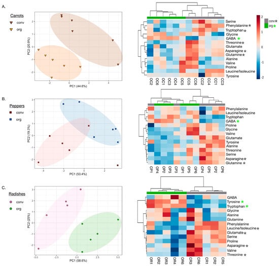 PCA and Heatmap of identified amino acid metabolites in fermented vegetables on day 14. (A) Conventional and regenerative fermented carrots, (B) conventional and regenerative radishes, and (C) conventional and regenerative peppers. PCAs based upon normalized data (normalization by sum; log transformation; autoscaling) and heatmaps based upon normalized data, Euclidean distances, and Ward clustering utilizing the average abundance of amino acids detected in each fermented vegetable. p < 0.05 according to Wilcoxon rank-sum test indicated by * for regenerative and * for conventional.