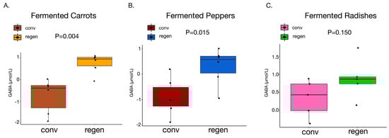 Amounts of GABA found in conventional and regenerative fermented vegetables. Boxplots of the amounts of GABA found between conventional and regenerative fermented vegetables (normalization by sum; log transformation; auto-scaling) for (A) Fermented Carrots (B) Fermented Peppers (C) Fermented Radishes. Statistical significance calculated by Student’s t-test.