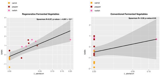 To further understand the possible drivers of increased GABA in regenerative vegetables, we performed a Spearman’s rank correlation analysis based on the relative abundance of taxa detected via 16S long-read sequencing and the normalized abundance of this metabolite. This analysis showed that a specific strain of Lactiplantibacillus plantarum (L. plantarum) has the strongest association with GABA (r = 0.73; p = 1.183 × 10−6) across all the dataset, including both conventional and regenerative samples. We then separated samples according to system (only the regenerative fermented vegetables and only the conventional fermented vegetables) and repeated the analysis. There was a significant positive correlation between GABA and L. plantarum observed in the regenerative fermented vegetables, and specifically, in the regenerative fermented peppers and radishes, which seemed to drive this strong correlation (Figure 7; r = 0.87; p-value = 4.691 × 10−6). On the other hand, no significant correlation was detected with the conventional fermented vegetables between GABA and L. plantarum. These analyses are concordant, to some extent, with the differential abundance of bacterial taxa (Figure 4), in which it was shown that different strains of L. plantarum were the most distinctive markers of regenerative versus conventional vegetables, particularly in peppers.