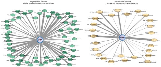 Networks between GABA and bacterial taxa in regenerative and conventional fermented vegetables. Analysis of the strong positive correlations between GABA and bacterial taxa (r > +0.5; p-value < 0.05) of all the regenerative fermented vegetables and conventional fermented vegetables shows that GABA has more significant positive correlations in the regenerative network. Node is showing the bacterial taxa, and the edge line demonstrates the strength of the correlation between GABA and any given taxa.