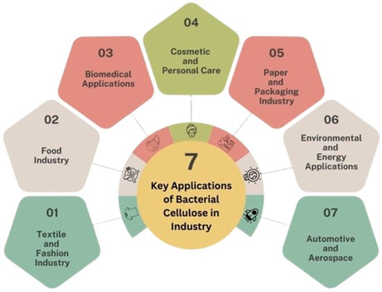 Bacterium aceti was first identified by A.J. Brown in 1886 during his experiment on acetic fermentation. Due to its distinctive fermentation yield by cellulose formation, he classified B. aceti into B. xylinum (A. xylinum) [8]. Later, Yamada and colleagues in 2012 recognized the combination phenotypic characteristic from former genera, which were Acetobacter, Gluconobacter, Asaia, Swaminathania, Saccharibacter, Neoasaia, Granulibacter, Tanticharoenia, Ameyamaea, and Neokomagataea. They proposed a new genus, Komagateibacter (gen. nov.), in honor of Dr. Kazuo Komagata, a Professor at the University of Tokyo, Bunkyo-ku, Tokyo, Japan, who made immense contributions to bacterial systematics, particularly of acetic acid bacteria [23]. In 1990, Brown and colleagues [19] successfully isolated and sequenced a gene involved in cellulose biosynthesis from A. xylinum [8,19]. This strain is widely recognized as a model organism for cellulose synthesis due to its highly crystalline structure and remarkable mechanical stability [19,24]. Moreover, the insertion of cellulose synthase genes into diverse organisms has emerged as a pioneering technique and a hallmark step in modifying cellulose formation in bacteria for tailored applications. This advancement underpins the large-scale industrial production of bacterial cellulose (BC), significantly enhancing its potential for the development of high-value, functional materials across various fields. The key industrial applications of BC are illustrated in Figure 1.