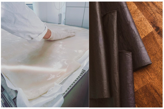 Through microbial fermentation processes, nanocellulose can be synthesized, harvested, and processed into a leather-like material [1,10,26,32]. This method requires fewer resources than traditional leather tanning or synthetic leather manufacturing [10,32]. Microbial synthesis of nanocellulose fibers, primarily by bacteria such as K. xylinus, which generates a dense and highly pure cellulose structure [10,24]. Due to its remarkable mechanical properties, BC is receiving significant attention in the fashion and material science sectors for its potential to replace traditional leather and synthetic polymers in various applications [10,26,32]. Several innovative companies are leading the charge in utilizing BC to manufacture sustainable and functional fashion products. Modern Synthesis [33], based in the UK, is pioneering the use of BC to develop next-generation bio-fabrics for footwear and apparel. This company focuses on cultivating BC composite materials and yarn-reinforced bacterial cellulose hybrid materials focusing on fashion and textile applications. Nanollose [34], an Australian biotech company, is also at the forefront of BC innovation with its creation of Nullarbor™ Tree-Free lyocell fiber, which is spun into yarn, with potential use in garments. Another notable company, ScobyTec [35] from Germany, specializes in producing Scoby leather—a 100% biodegradable and vegan leather alternative made from BC. Although no official cooperation was announced, ScobyTech showcased several sample products using their material. Similarly, the Hungarian-Estonian start-up Smobya [36] is developing NanoTwine™, a nanocellulose manufacturing platform to produce BC in a high-quality, cost-competitive way to displace animal and fossil fuel-based materials in leather-like and cosmetic applications. Figure 2 depicts the starting material of bacterial cellulose (BC) and the leather-like material produced from it.