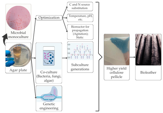 Challenges remain in maintaining the homogeneity and yield of BC, particularly in industries such as fashion, where high-quality cellulose layers are essential. The thickness and durability of the cellulose layer directly impacts the quality of bio-leather produced [6,15]. Researchers have conducted numerous experiments in recent decades, concerning optimizing nutrient sources, acclimatization techniques, and bacterial propagation [1,6,7,11,18]. Recent studies have also explored by utilizing cocultures with yeast, microalgae, and other bacteria to improve fermentation processes [17,21,22]. Advances in genetic engineering are also being applied to create unique biomaterials with tailored properties, as performed by several of BC manufacture [18,21].