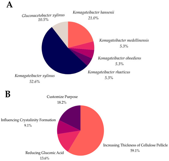 Data that were collected from previous studies indicate that K. xylinus is the most used strain for genetic modification (52.6%), followed by K. hansenii (21.0%) and G. xylinus (10.5%). Less commonly used strains for genetic engineering are K. rhaeticus, K. oboediens, and K. medellinensis at 5.3%, respectively.