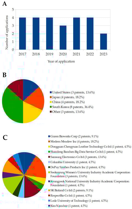 A patent search was conducted using the European Espacenet database, with further verification through Google Patents. The search employed keywords such as “Komagataibacter”, “bacterial cellulose”, “leather”, “sustainable textile”, and “biofabrication”, resulting in 23 published patents from 2017 to 2023 (Table 4). Patents in this domain are geographically diverse, although the number of applications has declined since 2017 (Figure 6A). South Korea holds the largest share of patents (36.4%), followed by China and Japan (18.2% each), with additional contributions from the United States, Poland, and Turkey (Figure 6B). Modern Meadow Inc. leads in patent publications, holding 18.2% of the patents, followed by Samsung Electronics Co., and Sookmyung Women’s University Industry-Academic Cooperation Foundation (13.6% each). Other notable contributors include Gozen Bioworks Corp. and SK Bioland Co. (9.1% each), along with Dongguan Chengyuan Leather Technology Co., Ltd., Shandong Baochen Big Data Services Co., Ltd., Columbia University, DePuy Synthes Product Inc., RespectBio Co., Ltd., Kyungpook National University Industry-Academic Cooperation Foundation, and Song Ji-eun et al. (4.5% each) (Figure 6C). Figure 6 illustrates the fluctuation in the number of registrations and publications of applications utilizing bacterial cellulose (BC) for biofabrication purposes between 2017 and 2023. While the data initially show a consistent high trend from 2017 to 2019, with four applications each year, there was a noticeable decline starting in 2020, where the number dropped to three applications. This downward trend continued in 2022 and 2023. Based on this observed pattern, it is projected that this decreasing trend may persist in subsequent years, potentially reflecting challenges in the development and commercialization of BC-based biofabrication technologies.