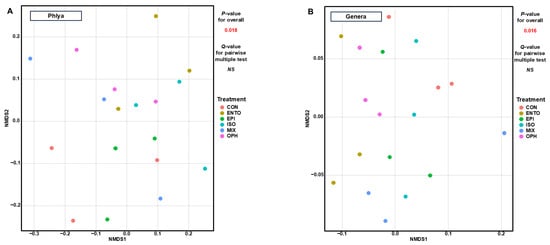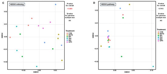 NMDS plots for overall microbiota at different taxonomic levels (phyla, (A); genera, (B), respectively), and prokaryotic functional profile (KEGG orthologs, (C); KEGG pathways, (D), respectively) based on the Bray–Curtis dissimilarity. Red font indicates statistically significant differences (p ≤ 0.05). CON, control group without ciliate added; ENTO, small entodinia inoculated; EPI, Epidinium spp. inoculated; ISO, isotrichids inoculated; OPH, Ophryoscolex spp. inoculated; MIX, mixed group with small entodinia, Epidinium spp., isotrichids, and Ophryoscolex spp. inoculated; NS, no significant difference between treatment groups.