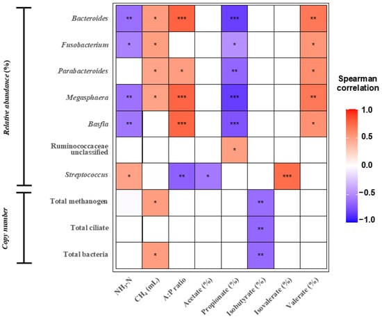Heatmap of Spearman’s correlation coefficients between the in vitro rumen fermentation parameters and relative abundance of differentially abundant bacterial genera, as well as log copy number total methanogen, total ciliates, and total bacteria after 24 h of incubation (|r| ≥ 0.4, *, p ≤ 0.05; **, p < 0.01; ***, p < 0.001). NH3-N, ammonia nitrogen; A:P ratio, acetate-to-propionate ratio.