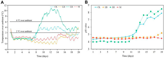 (A) Temperature and (B) pH dynamics of Italian ryegrass silage during aerobic exposure. CK, untreated; LR, Lactobacillus rhamnosus BDy3-10; LB, Lactobacillus buchneri TSy1-3; M, two-LAB mixture.