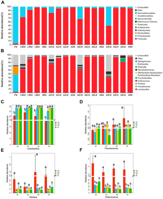 Relative abundance of bacterial communities in Italian ryegrass silage. (A) at the phylum level; (B) at the genus level; Statistical analysis of dominant bacterial genera during aerobic exposure, (C) Lactobacillus; (D) Pseudomonas; (E) Pantoea; (F) Enterococcus. Different lowercase letters (a,b) indicate significant differences between treatments on the same day during aerobic exposure. FM, fresh sample; 60, silage for 60 days; A2, A6, and A9, 2nd, 6th, and 9th day of aerobic exposure; CK, untreated; LR, Lactobacillus rhamnosus BDy3-10; LB, Lactobacillus buchneri TSy1-3; M, two-LAB mixture.