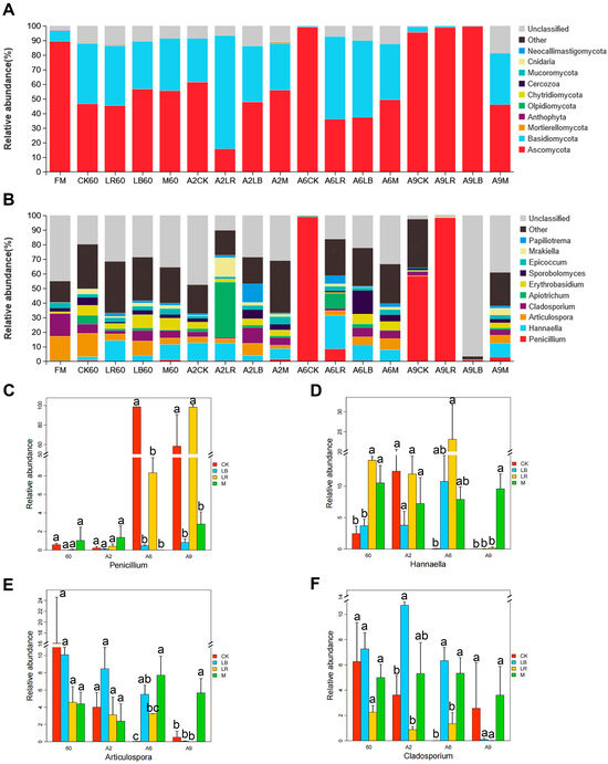 Relative abundance of fungal communities in Italian ryegrass silage. (A) At the phylum level; (B) at the genus level; statistical analysis of dominant fungal genera during aerobic exposure, (C) Penicillium; (D) Hannaella; (E) Articulospora; (F) Cladosporium. Different lowercase letters (a–c) indicate significant differences among treatments on the same day during aerobic exposure. FM, fresh sample; 60, silage for 60 days; A2, A6, and A9, 2nd, 6th, and 9th day of aerobic exposure; CK, untreated; LR, Lactobacillus rhamnosus BDy3-10; LB, Lactobacillus buchneri TSy1-3; M, two-LAB mixture.