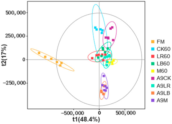Partial least squares discriminant analysis (PLS-DA) of metabolic profiles in Italian ryegrass silage (n = 6). The input data was the total mass of the signal integration area of each sample, and the signal integration area was normalized using the internal standard normalization method for each sample. FM, fresh sample; 60, silage for 60 days, A9, 9th day of aerobic exposure. CK, untreated; LR, Lactobacillus rhamnosus BDy3-10; LB, Lactobacillus buchneri TSy1-3; M, two-LAB mixture.