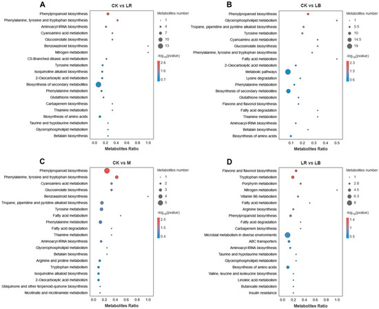KEGG pathway enrichment analysis of differentially accumulated metabolites. (A) CK and LR; (B) CK and LB; (C) CK and M; (D) LR and LB. CK, untreated; LR, Lactobacillus rhamnosus BDy3-10; LB, Lactobacillus buchneri TSy1-3; M, two-LAB mixture.