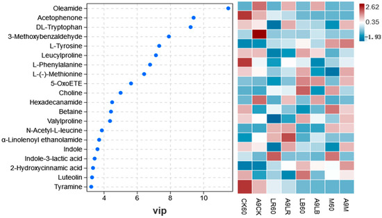 A scatter plot of the top 20 distinct metabolites was identified by applying variable importance projection (VIP). CK, untreated; LR, Lactobacillus rhamnosus BDy3-10; LB, Lactobacillus buchneri TSy1-3; M, two-LAB mixture.