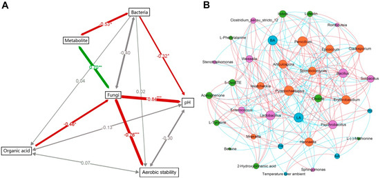 (A) Structural equation model (SEM) describing the effects of multiple drivers on the aerobic stability (temperature over ambient) of Italian ryegrass silage. The magnitude of the path coefficients is indicated by the width of the arrows, with green and red colors used to represent positive and negative effects, respectively. Grey lines represent tested, but not significant, paths. The degree of statistical significance is indicated by the following symbols: * (p < 0.05), ** (p < 0.01) and *** (p < 0.001). The category of organic acids includes lactic acid (LA), acetic acid (AA), propionic acid (PA), and butyric acid (BA). (B) The following is a co-occurrence network of physicochemical properties, metabolites, and microbes, based on the Spearman correlation. The circles depicted in purple, orange, blue, and green represent bacteria, fungi, physicochemical properties, and metabolites, respectively. The red, grey, and blue-grey colors represent positive and negative interactions, respectively.