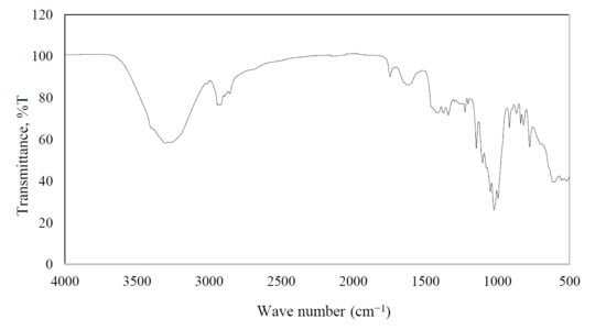 The content of fig waste used in this study is presented in Table 1. As can be seen, the carbon content of fig is 30.8%, and the nitrogen and phosphorus contents are 3.55% and 1.24%, respectively. On the other hand, the lignin ratio (7.68%) is higher compared to the cellulose (0.45%) and hemicellulose (5.49%) content. The total sugar content of the fig used is 57%. When all these are evaluated, it can be said that the fig is rich in carbohydrates and that polysaccharides are found in lesser amounts in the carbohydrate profile. Fourier Transform Infrared Spectroscopy (FT-IR) analysis was performed to get the chemical makeup of dried figs, and the results are shown in Figure 1.