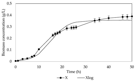 Figure 2 illustrates the time-varying biomass concentration of T. thermosaccharolyticum DSM 571 in the growth media. It took roughly 10 h for the culture to acclimate to the growth medium and surroundings, as shown in Figure 2. Following the 8–10 h lag phase, the culture grew exponentially for about 12 h. The biomass concentration remained slightly stable between the 22nd and 24th h, then increased to about 0.35 g/L, where it reached the stationary growth phase. The culture was harvested for inoculation after the exponential phase corresponding to the 36th h of the growth period. Experimentally measured biomass concentrations and time data were correlated with the logistic growth equation shown in Equation (2) [57] using Minitab (trial version) software. The curve shown as a straight line in Figure 2 was drawn using the Logistic equation, and it was compatible with the curve obtained using experimental points with an accuracy of 88%. X∞ and k were calculated as 0.356 g/L and 0.283 1/h, respectively.