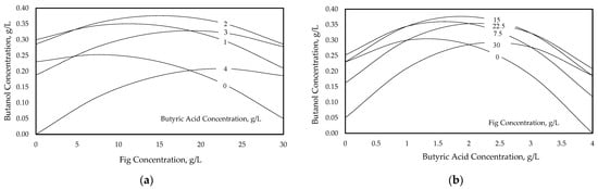 To examine the selected parameters over the full range, a model equation was created using the coefficients obtained from the Box–Wilson analysis, and the graphs in Figure 3 were plotted. Figure 3a shows the variation of butanol concentration with fig concentration at different fixed butyric acid concentrations. The highest butanol production occurred at 2 g/L butyric acid. In general, butanol concentration increased to about 10–20 g/L, fig concentration range, except at 0 g/L butyric acid concentration because of substrate limitation, and it decreased at fig concentrations higher than 20 g/L due to substrate inhibition. At substrate concentrations higher than 20 g/L, the bacteria may switch to another microbial activity instead of butanol production. On the other hand, at 0 g/L butyric acid concentration, butanol peaked at about 7 g/L fig concentration. It can be said that while the highest butanol production occurred at 1.6 g/L butyric acid and 16 g/L fig concentration, the lowest butanol production was obtained when fig and butyric acid concentrations were 30 and 0 g/L, respectively. The second lowest butanol concentration was found at a concentration of 4 g/L butyric acid and 30 g figs/L. A better view of the effect of butyric concentration at fixed fig concentrations is depicted in Figure 3b.