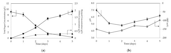 (a) Time-dependent change in butanol (▲), TVFA (■), and total sugar concentration (●) for the confirmation experiment. (b) Time-dependent change in pH (⬥) and ORP (⬦) for the confirmation experiment.