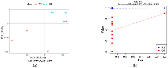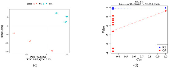 The OPLS-DA models comparing CK and YH are shown in Figure 2b for positive ion mode and Figure 2d for negative ion mode. The reliability of all models was demonstrated by R2 values that were consistently greater than their corresponding Q2 values, along with a negative Y-axis intercept for the Q2 regression line, confirming their validity and lack of overfitting.