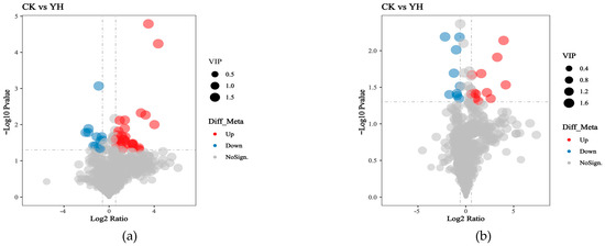 Figure 2a displays the OPLS-DA in positive ion mode, where the contribution rates of PC1 and PC2 to sample differences between CK and YH were 80.65%, indicating that the OPLS-DA effectively captured the variations between the groups. Figure 2c presents the OPLS-DA in negative ion mode, with contribution rates of PC1 and PC2 reaching 85.90%, demonstrating significant changes in metabolites between CK and YH.