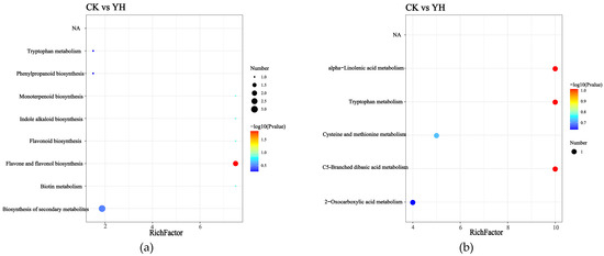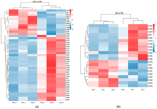 Figure 4a shows the hierarchical clustering under positive ion mode. Compared with CK, metabolites significantly increased in YH included tryptamine (C187), Leu-Ala (C187), Glu-Glu-Arg (C841), kaempferol (C343), fisetin (C617), trifolirhizin (C604), and carvone (C709), among others. Metabolites that were significantly higher in CK compared to YH included methylarecoline (C174), sinapine (C858), and ZZNWFORYMOJSKP-UHFFFAOYSA-N (C503).