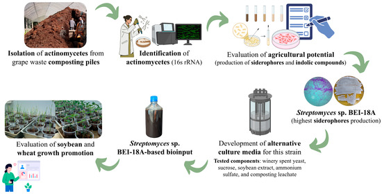 In this study, actinomycetes were isolated from grape waste composting piles and evaluated for their agricultural potential through the production of siderophores and indolic compounds. Streptomyces sp. BEI-18A was identified as the most promising strain due to its high siderophore production. An alternative culture medium (ACM) formulated with winery-spent yeast and composting leachate was developed to cultivate this actinomycete and produce a sustainable agricultural bioinput. Based on microbial growth performance, the final ACM composition was defined as 3 g/L spent yeast, 2 g/L sucrose, 1 g/L soybean extract, and 10% (v/v) composting leachate. This formulation yielded a Streptomyces sp. BEI-18A-based bioinput with a concentration of 7.8 × 107 CFU/mL (7.98 log CFU/mL). The bioinput enhanced several phytometric parameters of soybean and wheat, particularly at lower dosages (10, 50, and 100 mL/ha), with plant responses varying depending on the crop tested.