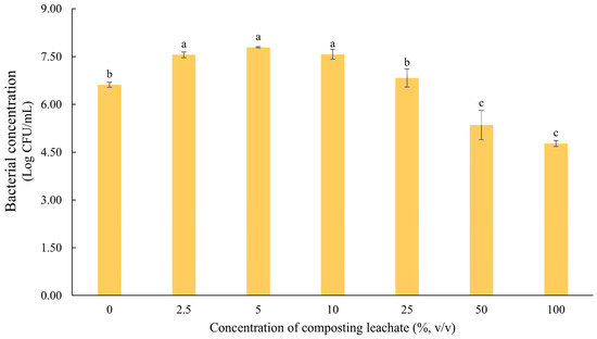 Streptomyces sp. BEI-18A growth after 48 h in the ACM with different concentrations of composting leachate. Different letters indicate a statistical difference (p < 0.05) according to Tukey’s test.
