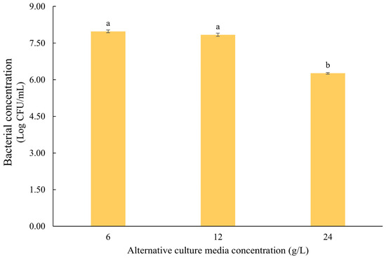 A decrease in ACM nutrient concentration from 12 g/L to 6 g/L (Figure 3) did not result in a significant difference in microbial growth (p > 0.05). From a cost-optimization perspective, it is advantageous that lower nutrient levels can sustain microbial growth comparable to ACMs formulated with higher amounts of SY, SC, and SE. Sari et al. [57] cultivated Streptomyces spp. in an ACM and applied it to experimental soybean cultivation, where they observed enhanced plant growth and inhibition of Fusarium oxysporum. Thus, Streptomyces spp. are promising microorganisms for secreting secondary metabolites that promote plant growth and/or suppress phytopathogens, reinforcing their potential for agricultural applications.