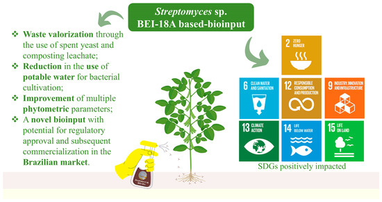 The cultivation of Streptomyces sp. BEI-18A in an alternative culture medium formulated with winery spent yeast and composting leachate represents a sustainable strategy for bioinput development. This approach is particularly relevant in Brazil, where no Streptomyces-based bioinput has yet been registered, highlighting a major technological gap. Beyond enhancing crop performance, this formulation advances several Sustainable Development Goals (SDGs). It contributes to SDG 2 (Zero Hunger) by increasing agricultural productivity, while the valorization of agro-industrial residues supports SDG 12 (Responsible Consumption and Production) and SDG 9 (Industry, Innovation, and Infrastructure). The reduction in fertilizer and pesticide use aligns with SDG 15 (Life on Land) and SDG 14 (Life Below Water), while replacing potable water with composting leachate directly addresses SDG 6 (Clean Water and Sanitation). Moreover, the overall reduction in environmental impacts strengthens SDG 13 (Climate Action). Collectively, these outcomes highlight the potential of actinomycete-based bioinputs to promote sustainable agriculture within a circular bioeconomy framework. The innovation and sustainability aspects of the bioinput, related to the development of an alternative culture medium for the bioprospected actinomycete, are illustrated in Figure 4, highlighting its alignment with several Sustainable Development Goals (SDGs).