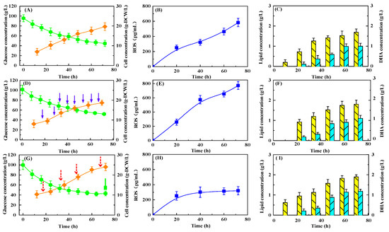 Production performance profiles in DHA fermentation under different feeding strategies. (A–C): Control group; (D–F): Strategy A (H2O2 intermittent feeding); (G–I): Strategy B (p-aminobenzoate intermittent feeding). (A,D,G): ♦: cell concentration;