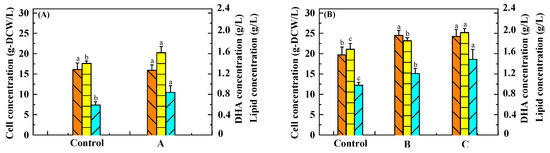Comparisons of key fermentation data across different control strategies. Error bars represent SDs of 3 replicates. Bars with different letters in the same color are significantly different at p < 0.05. (A): Comparisons of key fermentation data between the H2O2 intermittent feeding control strategy and the control group at 50 h of the fermentation process. (B): Comparisons of key fermentation data at the end of fermentation under the control strategy, p-aminobenzoate intermittent feeding strategy, and periodic control strategy. A: H2O2 intermittent feeding. B: p-aminobenzoate intermittent feeding. C: periodic control. (A,B): ❚: cell concentration; ❚: lipid concentration; ❚: DHA concentration.