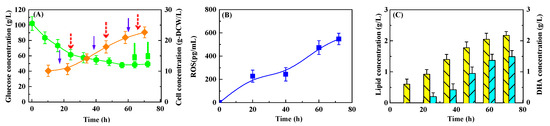 : glucose addition; (B): ■: ROS concentration; (C): ❚: DHA concentration; ❚: lipid concentration.