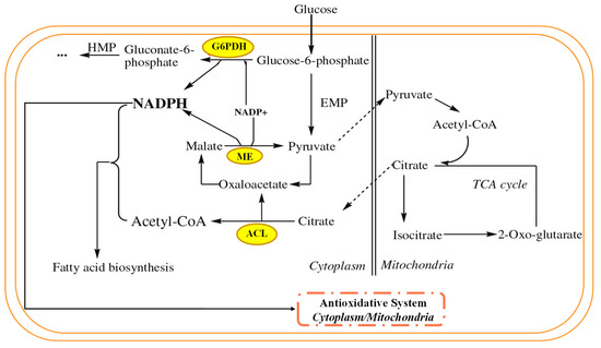 The levels of ROS were determined using the ROS ELISA kit (KT20911, Wuhan Mosak Biotechnology Co., Ltd., Wuhan, China). Its principle is as follows: purified ROS capture antibodies are coated on a microplate to form solid-phase antibodies. After sequential sample addition, binding occurs with HRP-labeled detection antibodies, resulting in the formation of an “antibody-antigen-enzyme-labeled antibody” complex. Following washing, TMB substrate is added: TMB is converted to blue via HRP catalysis and then to yellow after acid treatment. Absorbance at 450 nm is measured with a microplate reader (Infinite F50, Tecan, Männedorf, Switzerland), and ROS levels are calculated using the standard curve. The method for determining the activities of related enzymes—including malic enzyme (ME), glucose-6-phosphate dehydrogenase (G6PDH), and ATP citrate lyase (ACL)—is as follows. First, cells were resuspended in extraction buffer (100 mmol/L Tris-HCl, pH 7.4, containing 0.001 mol/L EDTA and 0.002 mol/L DTT), followed by 30-min ultrasonic disruption (455 W, 4 s on/4 s off) via a cell disrupter (JY92-IIN, Shanghai Jingqi Instruments Co., Ltd., Shanghai, China). The mixture was centrifuged at 5000× g for 15 min at 4 °C, and the supernatant was immediately collected to assay the activities of glucose-6-phosphate dehydrogenase (G6PDH), malic enzyme (ME), and ATP citrate lyase (ACL) per reported protocols [21,22]. In brief, G6PDH and ME activities were determined by monitoring the reduction of NADP+ to NADPH, quantified as the absorbance increase at 340 nm over 4 min at 25 °C. G6PDH reactions (3 mL) contained 0.1 mL Tris-HCl (1 mol/L, pH 7.4), 0.1 mL NADP+ (2 mmol/L), 0.1 mL glucose-6-phosphate (25 mmol/L), 0.1 mL MgCl2 (0.2 mol/L), 2.5 mL ddH2O, and 0.1 mL crude enzyme. ME reactions (3 mL) included 0.5 mL Tris-HCl (0.4 mol/L, pH 7.4), 0.2 mL NADP+ (3.4 mmol/L), 0.1 mL L-malate (30 mmol/L), 0.1 mL MgCl2 (0.12 mol/L), 2 mL ddH2O, and 0.1 mL crude enzyme. On the other hand, ACL activity was measured with the ATP Citrate Lyase Assay Kit (Ultraviolet Spectrophotometric, BA1920, Zhengzhou Leye-Bio Biotechnology, Zhengzhou, China). Principle: ACL cleaves citrate into acetyl-CoA, oxaloacetate, ADP, and phosphate (with ATP and coenzyme A); malate dehydrogenase then converts oxaloacetate NADH to malate NAD+, decreasing absorbance at 340 nm. ACL reactions (1 mL) comprised 0.805 mL Reagent A, 0.02 mL Reagent B, 0.1 mL Reagent C, 0.02 mL Reagent D, and 0.05 mL crude enzyme.