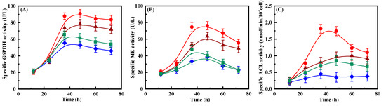 There was some doubt about why the different treatments produced similar trends of the enzyme activities; the reasons can be attributed as follows: under the traditional batch fermentation mode, cell growth could be basically divided into four stages: lag phase, logarithmic growth phase, stationary phase, and death phase. Correspondingly, a changing trend will also be exhibited by cellular activity (including enzyme activity): starting from low levels, progressing to rapid growth, then tending to stabilize, and finally declining gradually. Therefore, a certain similarity was shown by the changing trend of enzyme activity under different control strategies in this study.