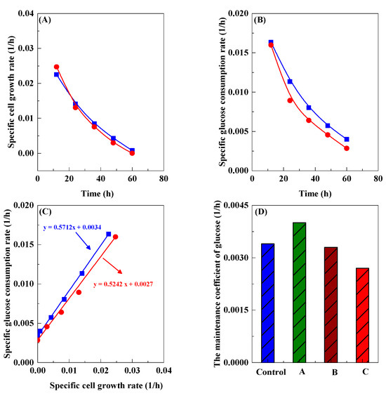 It is well known that oxidative stress induces a series of issues, such as damage to intracellular proteins (e.g., conformational denaturation), carbohydrates, nucleic acids, and other organelles [26,28,29]. Under this condition, to maintain normal cell’s metabolism, the carbon source (glucose) flux directed toward the maintenance metabolic pathway (i.e., sustaining the cell’s basic metabolic activities) increases significantly. It should be noted that maintenance energy is not a constant value; it fluctuates dynamically with environmental conditions. Specifically, when Schizochytrium sp. is exposed to stressful environments (e.g., abnormal temperatures, pH fluctuations, carbon/nitrogen source deficiency, oxidative stress), the cell’s basic metabolic consumption increases accordingly to maintain physiological homeostasis (e.g., repairing damaged organelles, regulating intracellular osmotic balance), which in turn leads to an elevation in the maintenance coefficient. Conversely, in a suitable fermentation environment, the maintenance coefficient remains at a stable “minimum threshold” level. In order to investigate the effects of oxidative stress on Schizochytrium sp. cells under different control strategies, the values of maintenance energy (m), which represents the amount of substrate consumed per unit biomass per unit time for maintenance, were calculated under different feeding strategies using a widely recognized equation by plotting the specific growth rate (1/h) on the abscissa and the specific glucose consumption rate (1/h) on the ordinate.