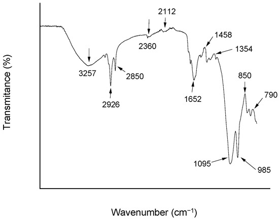 −1 range corresponding to O–H and N–H stretching vibrations, typically associated with hydroxyl groups from polysaccharides and amine groups from proteins. Bands between 2950 and 2850 cm